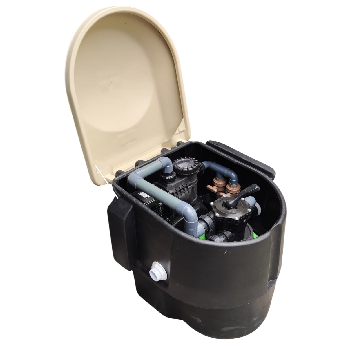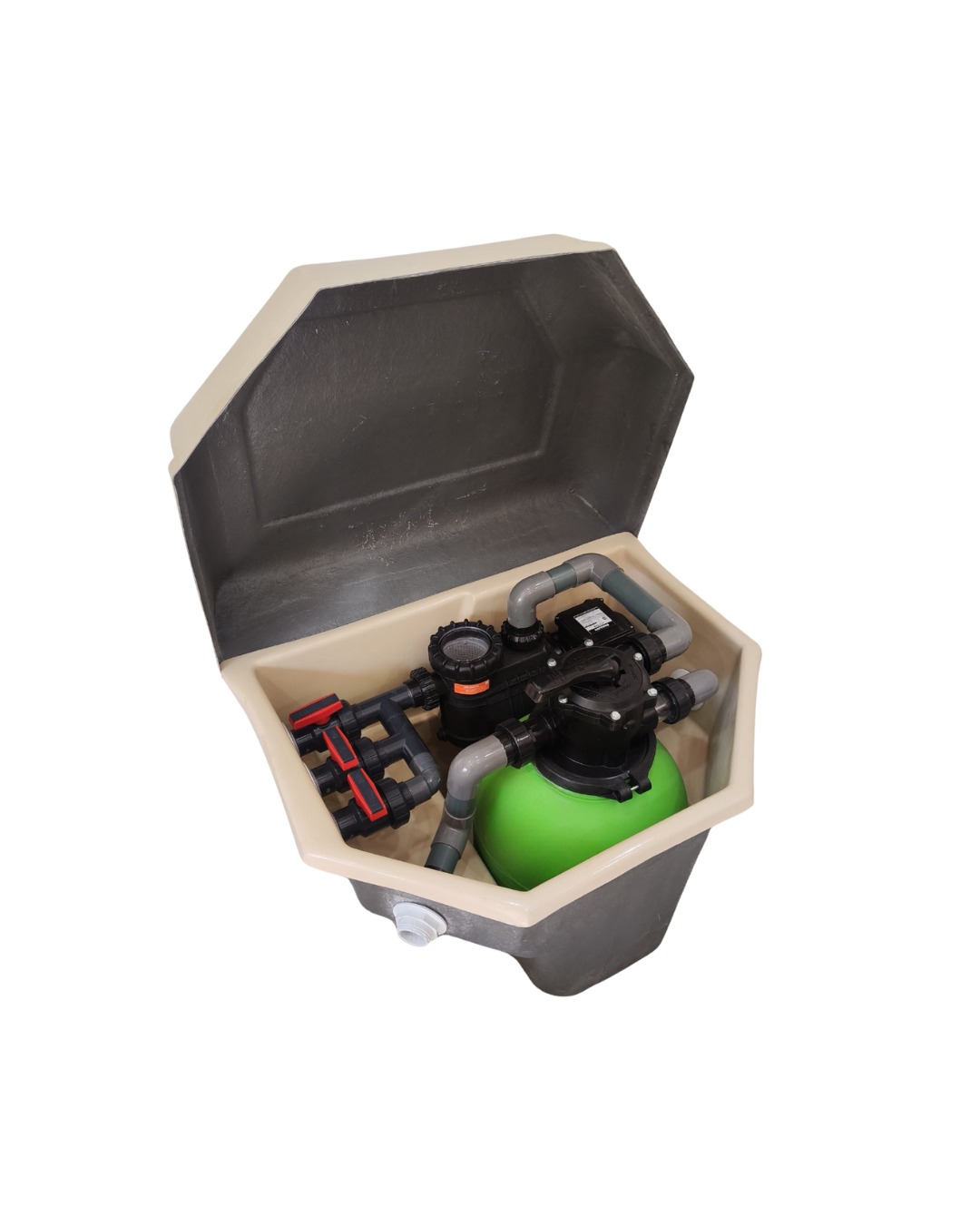 Gabinete fabricado en polietileno reforzado reciclado mediante proceso de rotomoldeo para piscinas desde 40.000 hasta 60.000 lts. Comando de 2 o 3 valvulas de entrada y 2 conexiones de salida.